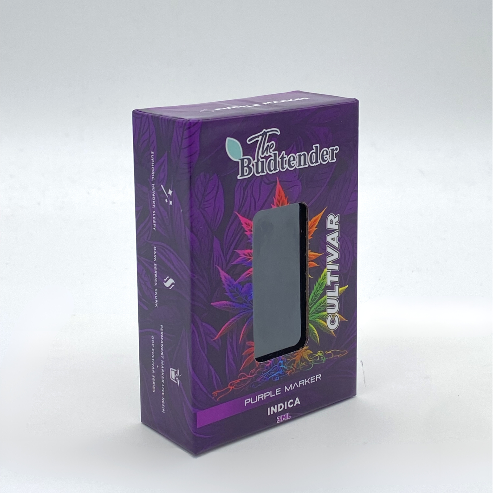 Make a bold statement with Budtender’s Live Resin Infused Cultivar Purple Marker vape, a powerful fusion that delivers a dank and unforgettable experience. Inspired by the Permanent Marker strain, this vape is as potent as a fresh black Sharpie. The flavour profile opens with floral notes that quickly give way to rich, dark berries and skunky, gassy undertones. Hints of sweet purple grape and a touch of adhesive blend into the bold flavor of this Biscotti x Sherb Bx x Jealousy cross.
